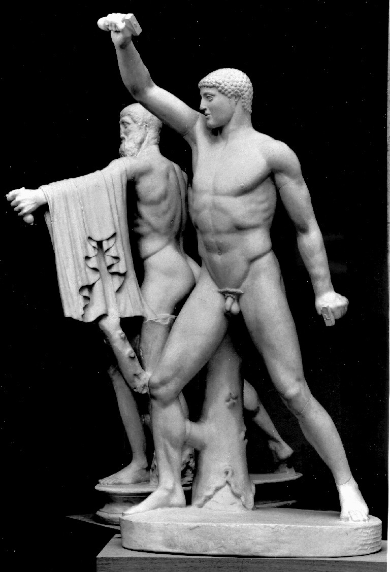 Die hochberühmte Zweifigurengruppe wird am besten dokumentiert durch eine heute in Neapel befindliche Marmorkopie (Inv. 572/573), welche im Zustand moderner Ergänzungen die beiden Männer zeigt, wie sie in energischem Ausfallschritt auf den nicht dargestellten Gegner zustürmen. Die Ovalplinthen, deren eine noch die originale Profilierung bewahrt hat, sind ebenso wie die der Standfestigkeit halber angebrachten Baumstammstütze Zutaten des römischen Kopisten, die das Bronzeoriginal nicht nötig hatte. Hier nicht zugehörig ist - neben den zum Teil irreführenden neuzeitlichen Ergänzungen - der bärtige Kopf des Älteren (Aristogeiton), der vielmehr Bruch an Bruch anpaßt an an eine in Rom am Fuß des kapitolinischen Hügels gefundene Torsoplastik, die hier nebenan zu sehen ist (Inv. 498). Sie bietet in ihrem mit Ausnahme von Teilen des linken Knies und Oberschenkels unergänzten Zustand ein wertvolles Korrektiv zur Überlieferung dieser Figur; ihr ist in dem deutlicher vom Körper abgespreizten linken Arm der Vorzug zu geben. Die kraftvoll-straffe Durchbildung der Körperreliefs mit den stärker herausgetriebenen Einzelformen, den bronzemäßig abgesetzten Brustwarzen und der hervortretenden Bauchader unterscheidet die kapitolinische Replik von der in Neapel.