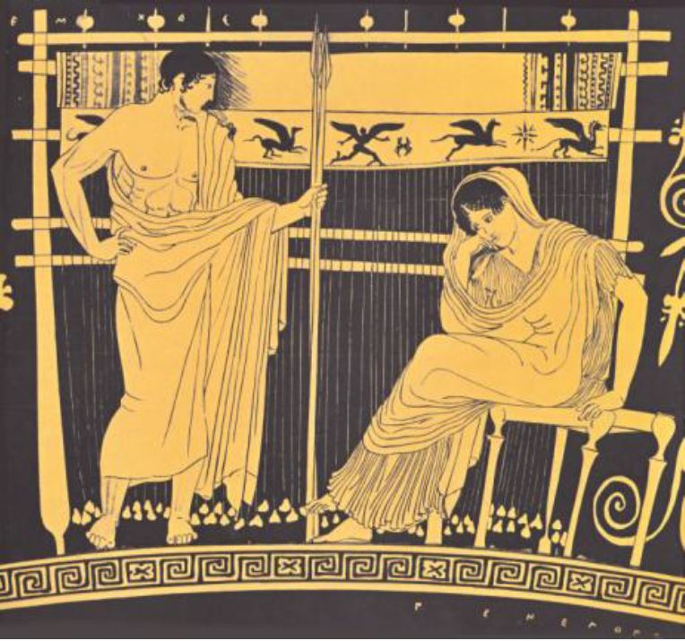 Penelope und Telemach vor dem Webstuhl, Um-zeichnung vom Skyphos aus Chiusi, um 440 v. Chr., Furtwängler / Reichhold Taf. 142