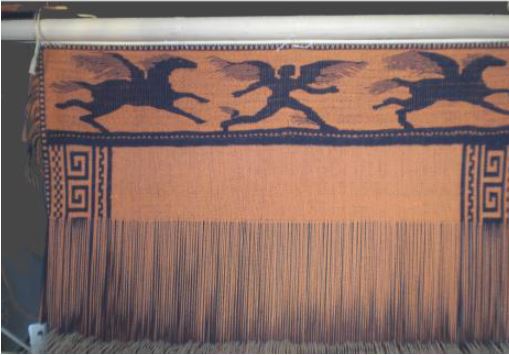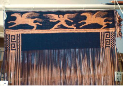 Der Webstuhl ist nicht nur im Hinblick auf den Auf- und Abbau sehr flexibel. Die mit seiner Hilfe produzierten Gewebe lassen sich in ihren Zwischenstadien leicht umorganisieren: Man kann die Kettrichtung ändern, die Litzen immer wieder neu knoten und mit Brettchenweberei kombinieren. Dies war vor allem für die Ausführung des Chiusi-Gewebes entscheidend (vgl. das Schema der Fäden, links). So sind beispielsweise die Schussfäden (blau) des kurzen, schma-len Anfangsbandes (1.) zugleich Kettfäden des Figurenbandes (2.), laufen aber am großen Gewebe (4.) wieder in Schussrichtung. Diese Art der Kombination von Bändern und Gewebearten erklärt die ansonsten schwer verständlichen Beschreibungen von Geweben, die uns aus der antike überliefert sind. Der Münchener Webstuhl belegt, dass solche Gewebe auf dem primitiven Gerät tatsächlich machbar sind.