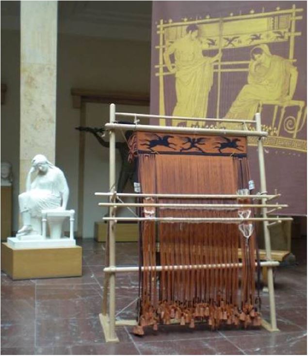 Anlässlich der Ausstellung „Penelope rekonstruiert“ wurde im Oktober 2006 ein Webstuhl hergestellt, der es ermöglichen sollte, eine Vorstellung von Penelopes großem Webstuhl mit dem umfassenden (oder auch: umfassten) Gewebe zu ermög-lichen. Der für diesen Zweck von Andreas Willmy angefertigte Gewichtswebstuhls war nicht als Rekonstruktion gedacht, sondern sollte vor allem funktionstüchtig sein. Keine der Darstellungen von antiken Webstühlen auf Vasen ist realistisch genug, um als Nachbauanleitung genutzt werden zu können. Wir wissen nichts über das Material und die Art der Verbindung der Elemente. Der Münchener Webstuhl hat keine festen Verbindungen und sollte möglichst mit textilen Mitteln (also Schnüren und Seilen) leicht auf- und abzubauen sein. Er erhielt eine Stütze, weil er für die Präsentation frei im Ausstellungsraum stehen sollte. Zwar war diese Art der Aufstellung vermutlich nicht üblich, aber andererseits auch nicht ungewöhnlich (vgl. Hoffmann Fig. 126, 127 und 128 auf den Seiten 301-305).