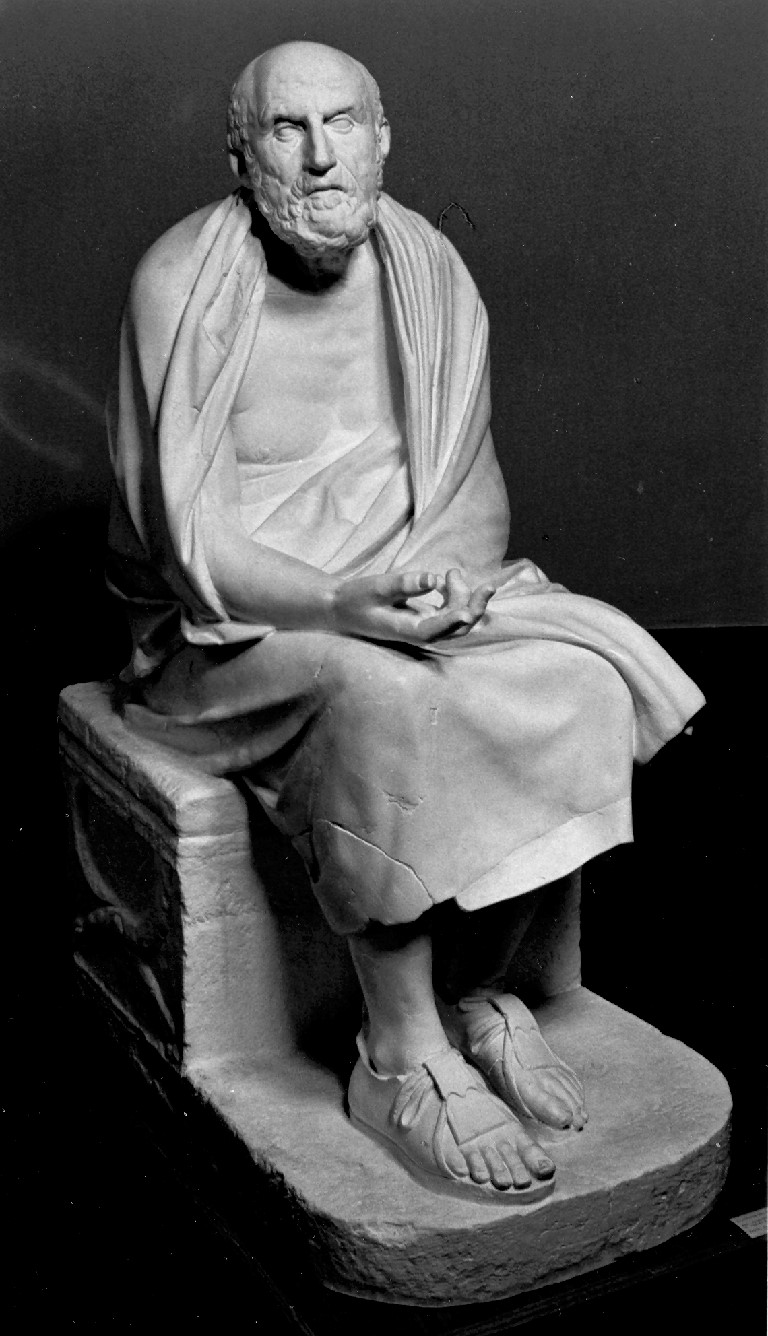 Das Bildnis des Philosophen (Abguß Th 38) ist allein in der Sitzstatue im Louvre (ehemals Slg. Borghese) und einer Statuette im Konservatorenpalast (Abguß Th 28), sein Kopf dagegen in 16 Repliken überliefert, von denen diejenigen in Neapel (Abguß Th 126) und London (Abguß B 14) am ehesten eine Vorstellung vom Original vermitteln. Auf die Statuette wird im Verlauf des Textes nicht näher eingegangen, da sie über die allgemeine Bestätigung von Sitzmotiv und Manteldrapierung hinaus keine zusätzlichen Details des Philosophenbildnisses überliefert.